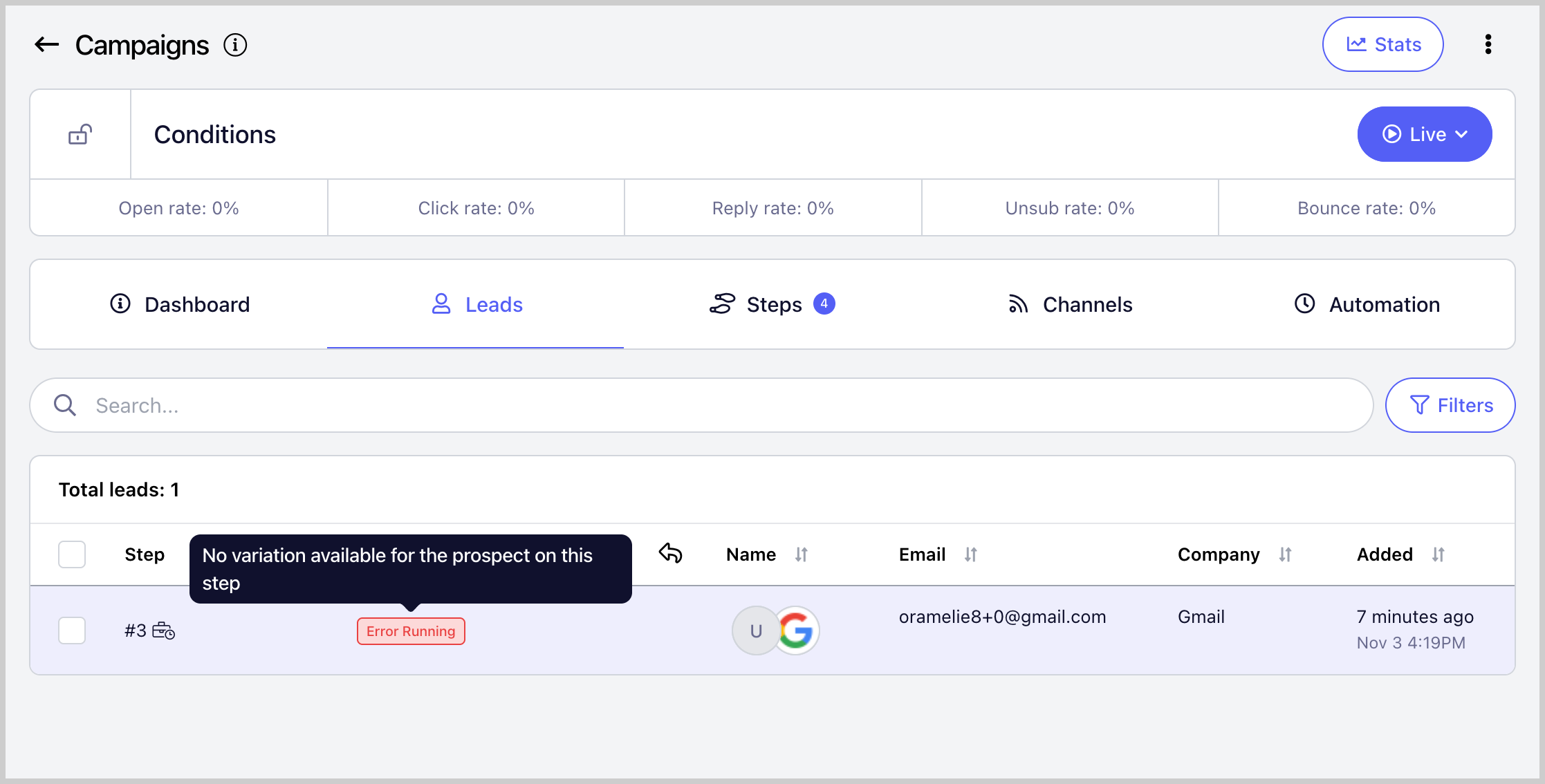 Campaigns in QuickMail work in a linear way. The lead's campaign progress will stop if they don’t meet a certain condition, and their status will appear as Error Running.