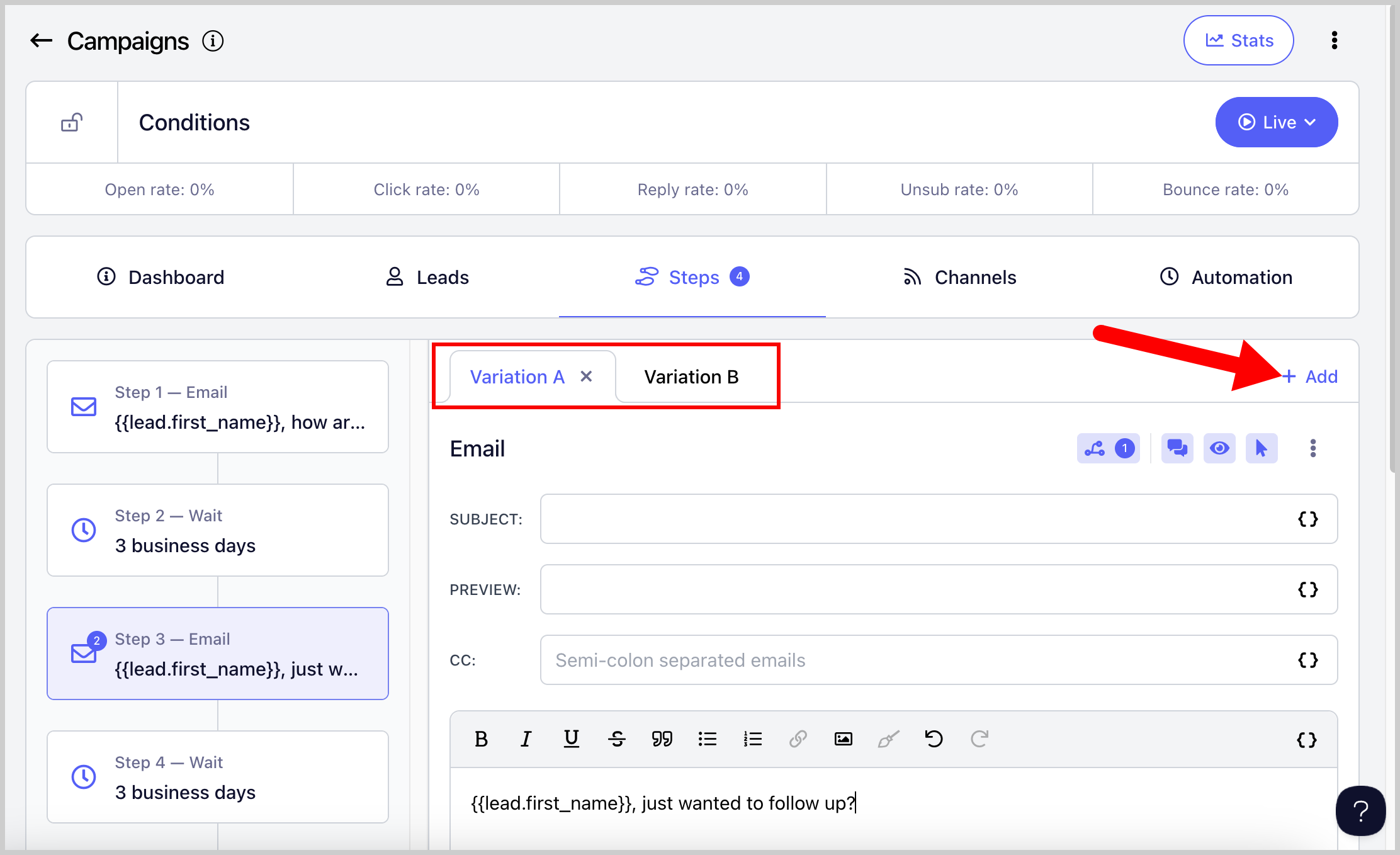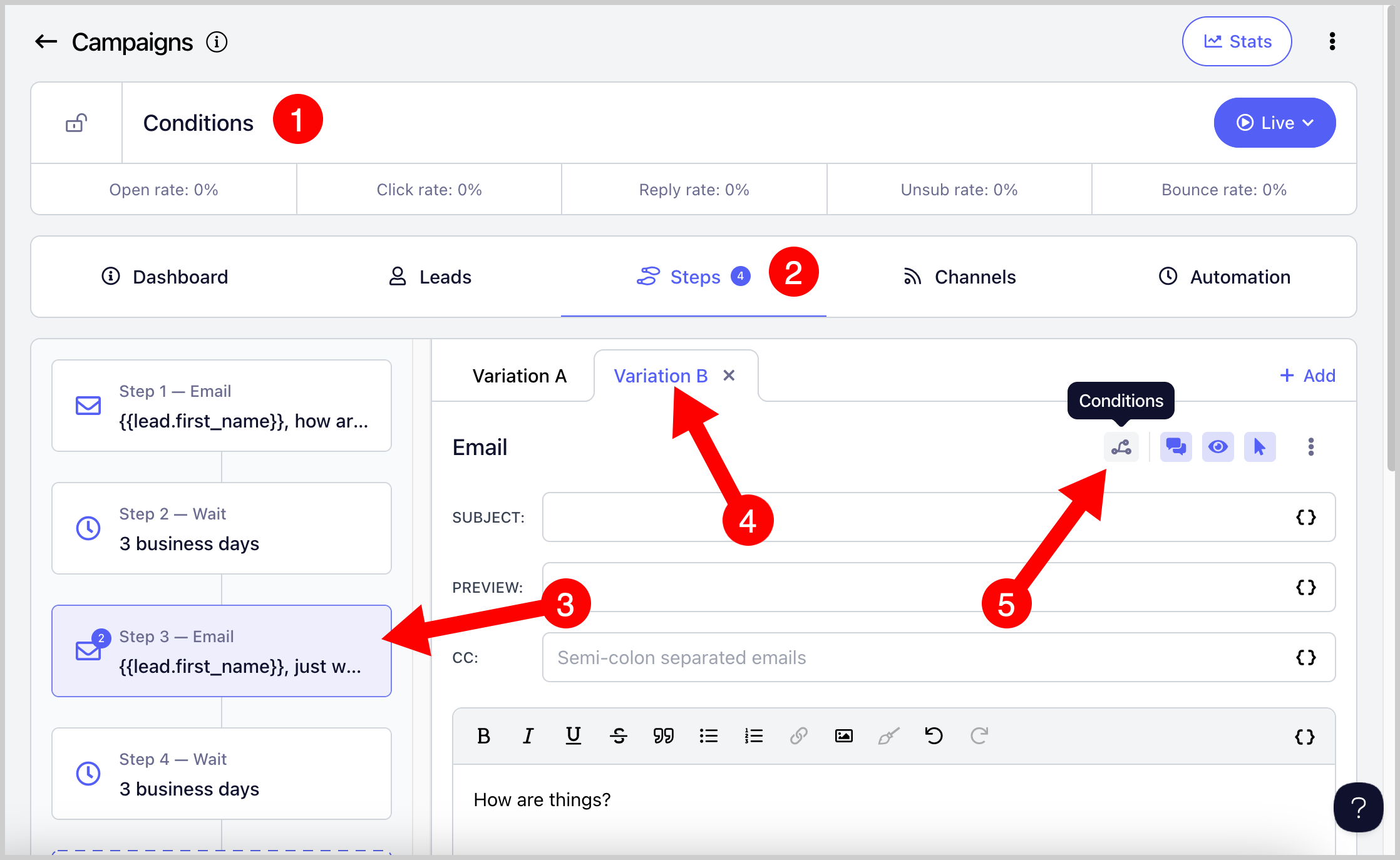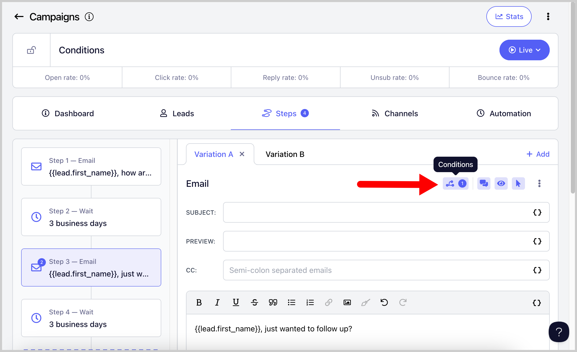 By using conditions, you can control which email variation a lead receives when they move to a step in a campaign.
