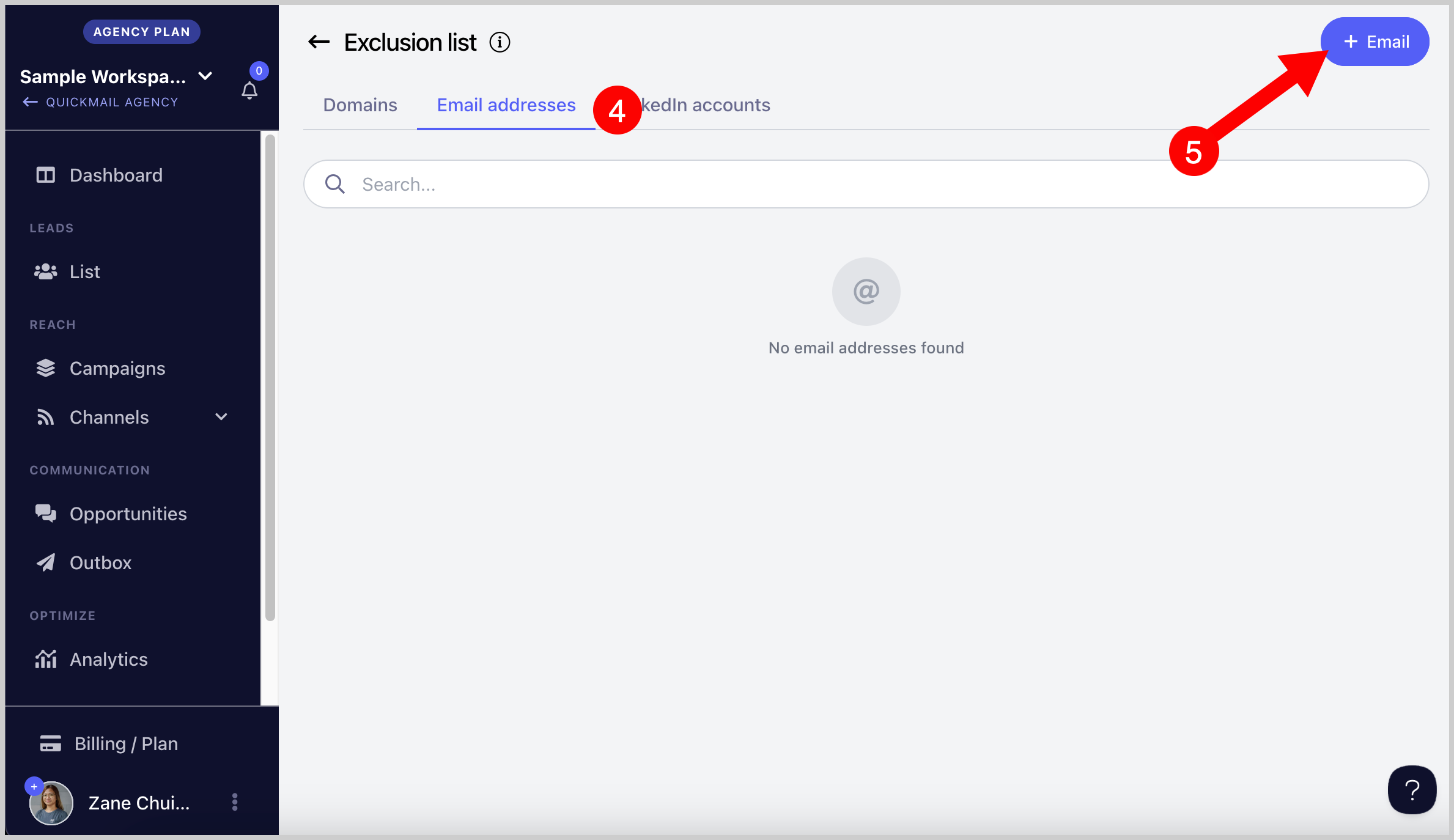 Note: If a lead is using a domain listed under the domain exclude list, the lead will not be able to start any campaign in the account and any running journey will also get canceled.