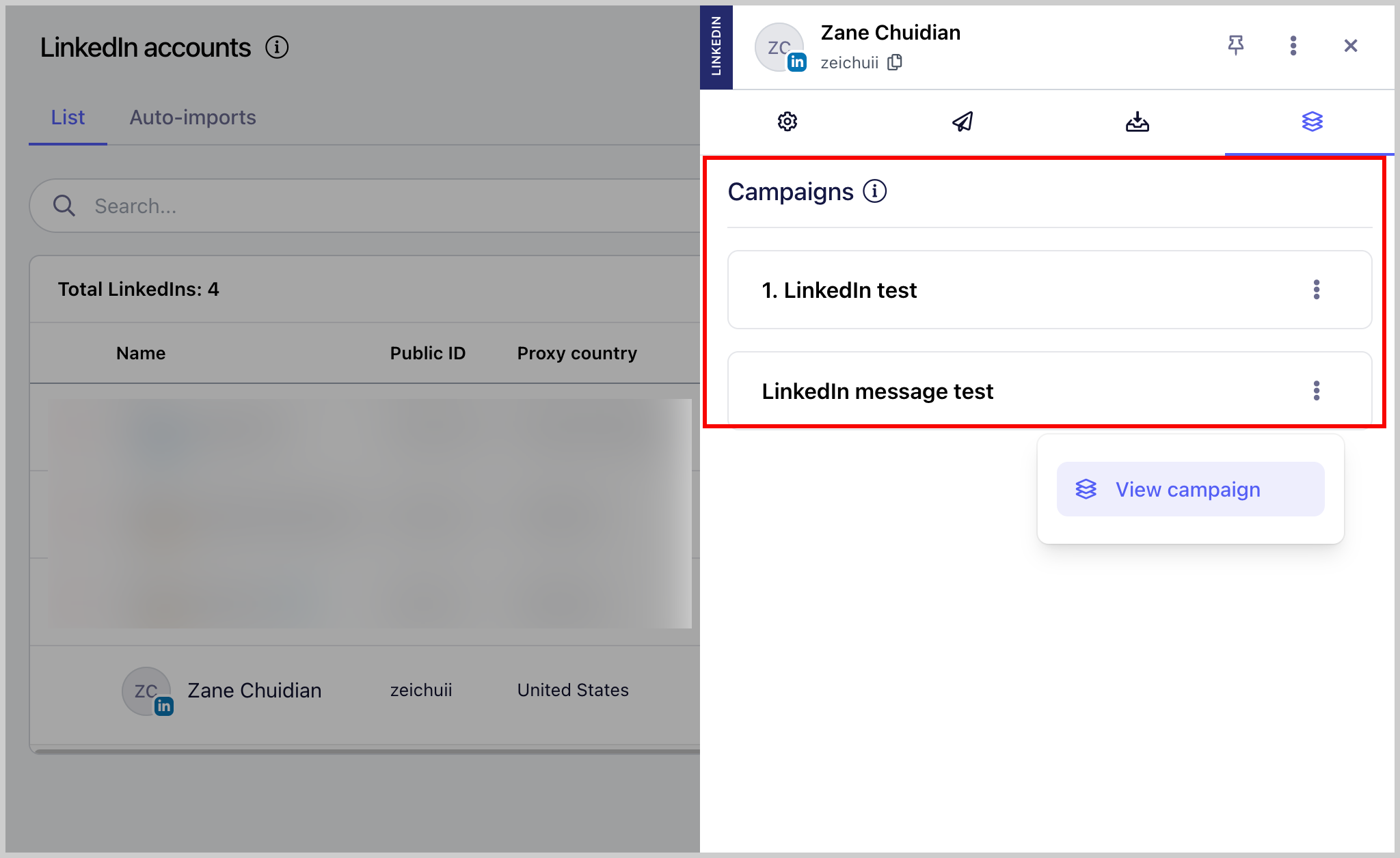 π‘ Pro tip: You can assign as many LinkedIn accounts as you need to the campaign. You can check a LinkedIn account's quickview in the Channels page or in the Channels page of the campaign to easily see the campaigns where it is assigned.