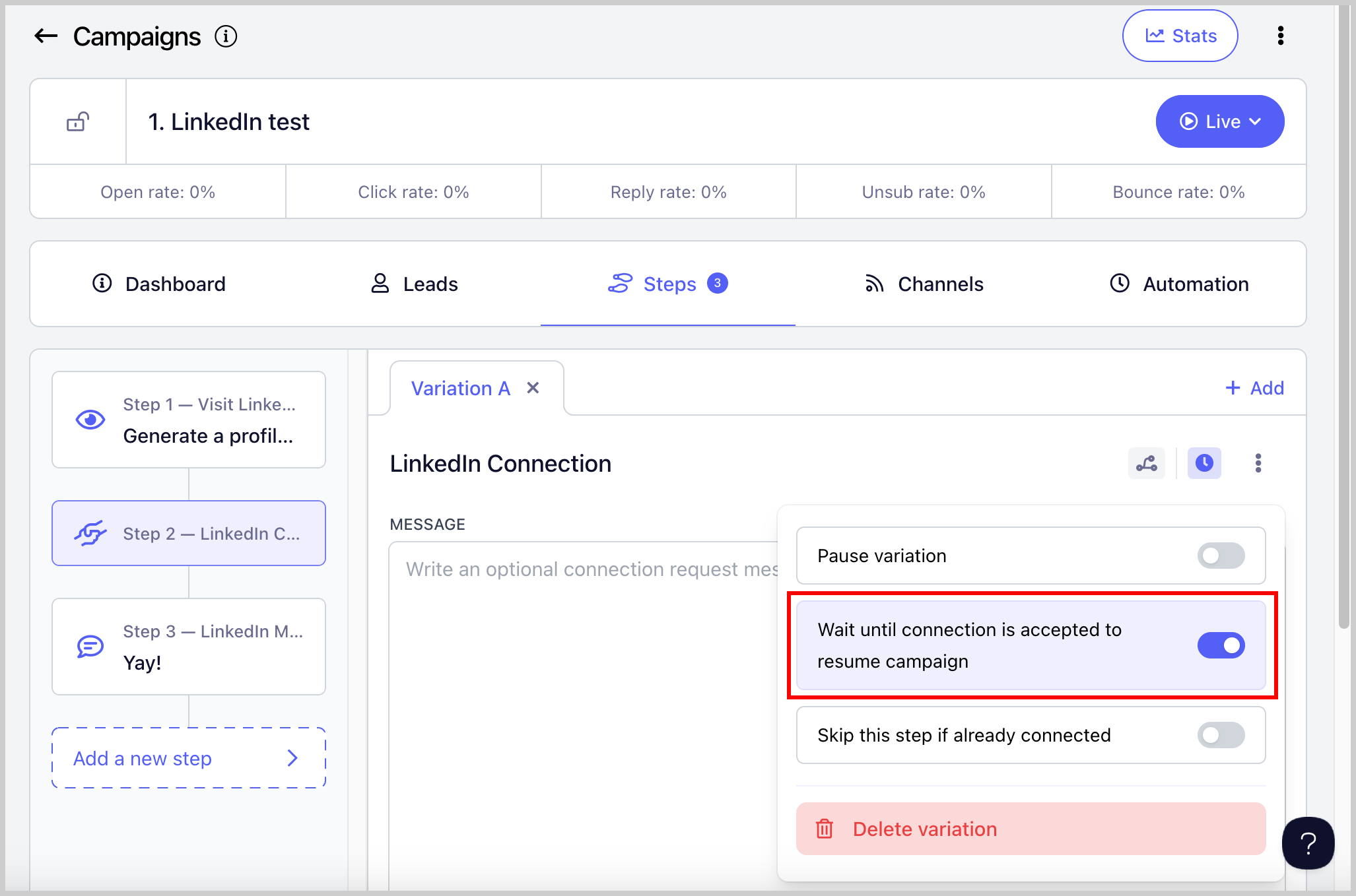 - Therefore, the setting 'Wait Until Connection Request' on a LinkedIn Connection Request Step is enabled by default. This means that the lead won't proceed to the next step, until the connection request is accepted. You can disable this setting here: