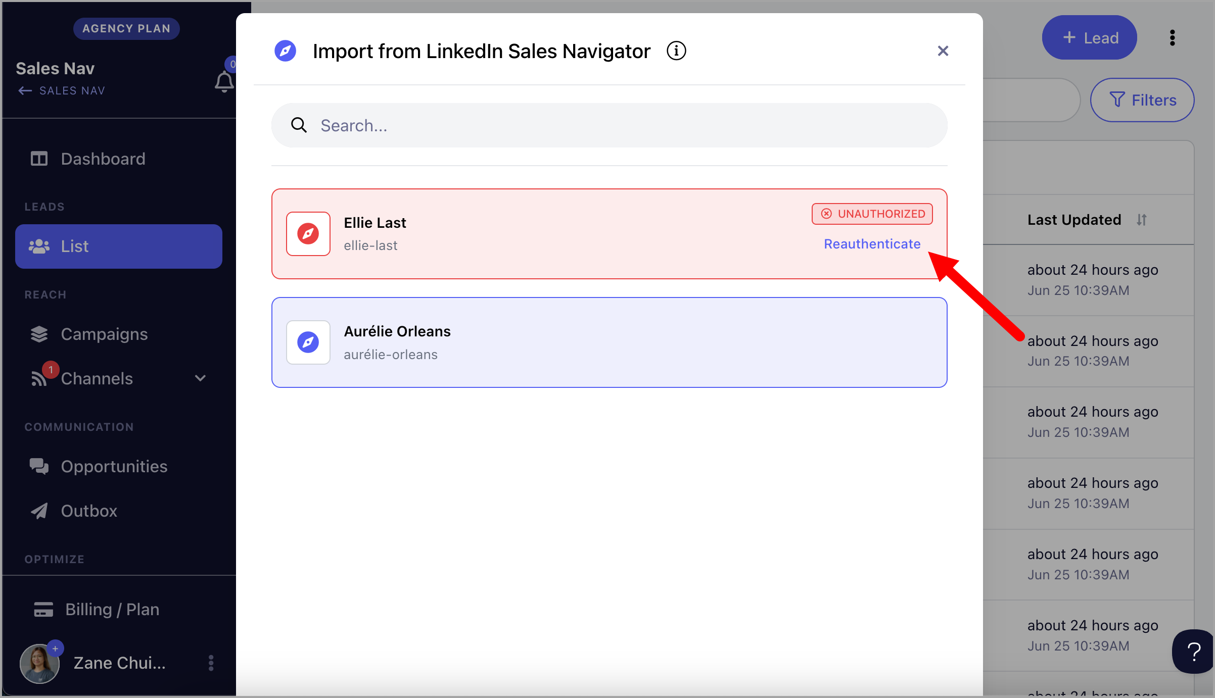When we lose permission to access your LinkedIn account, it will be highlighted in red, and it will no longer be possible to import from Sales Navigator.