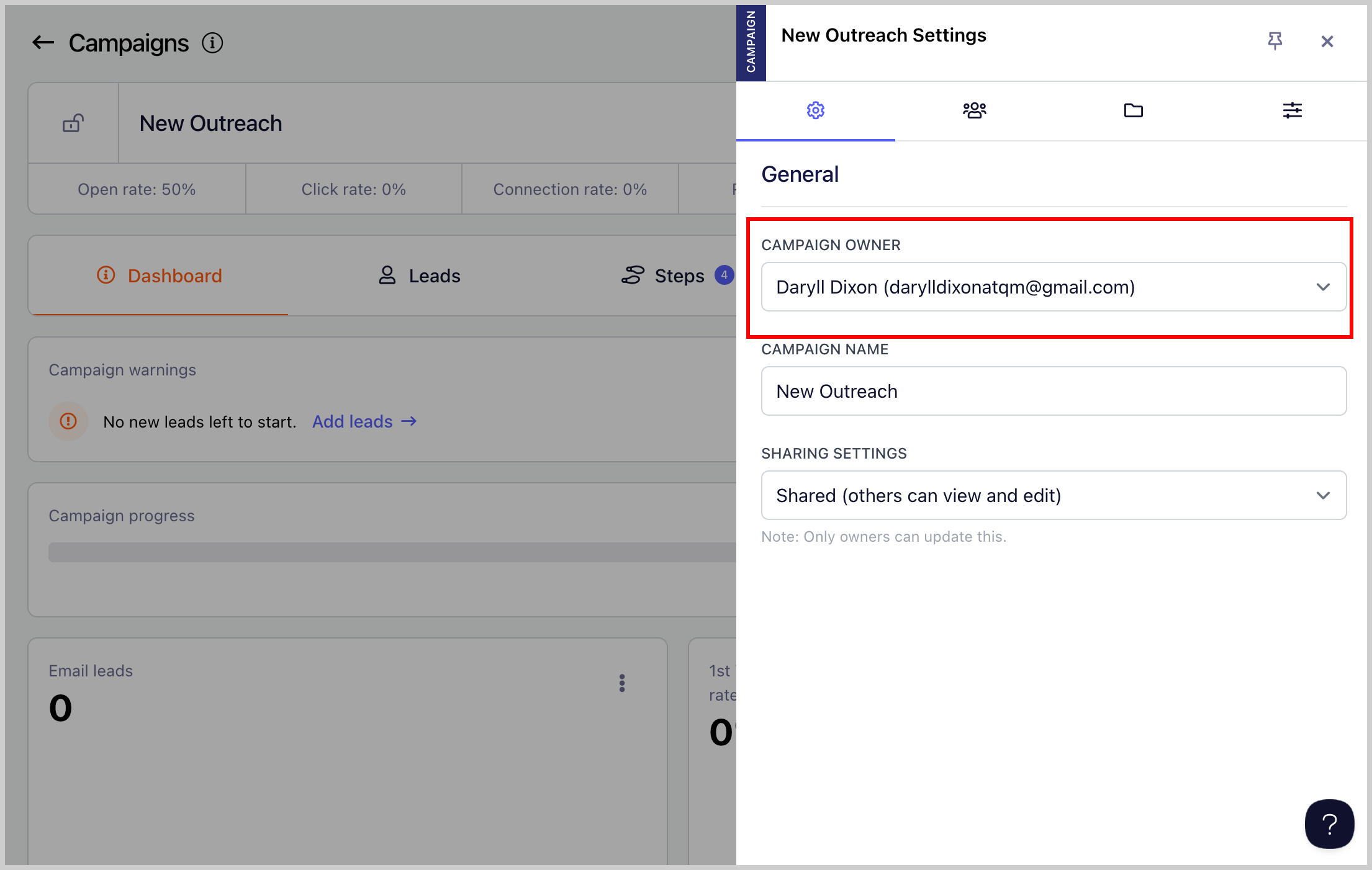 Note: Only team members and guests can be assigned as campaign owners.